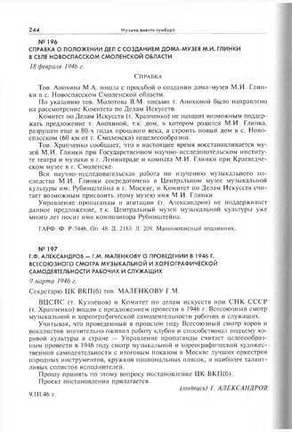 Справка о положении дел с созданием дома-музея М.И. Глинки в селе Новоспасском Смоленской области. 18 февраля 1946 г.