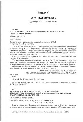 М.Б. Храпченко - К.Е. Ворошилову о возможности показа оперы «Великая дружба». 15 декабря 1947 г.