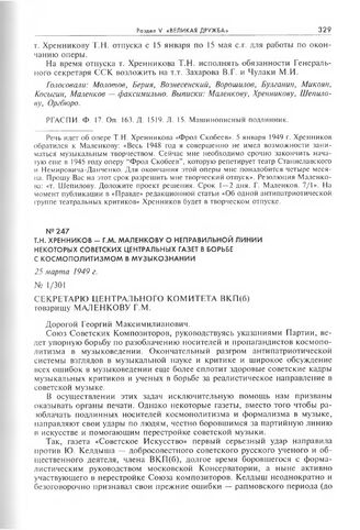 Т.Н. Хренников - Г.М. Маленкову о неправильной линии некоторых советских центральных газет в борьбе с космополитизмом в музыкознании. 25 марта 1949 г.
