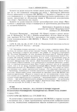 В.С. Кружков и П.А. Тарасов - М.А. Суслову о порядке издания музыкальных произведений, посвященных В.И. Ленину и И.В. Сталину. 4 апреля 1950 г. // РГАСПИ. Ф. 17. Оп. 132. Д. 418 Л. 22-25. Машинописный подлинник.