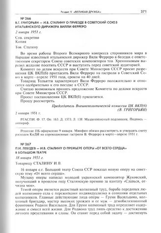 П.И. Лебедев - И.В. Сталину о премьере оперы «От всего сердца» в Большом театре. 18 января 1951 г. // РГАСПИ. Ф. 17. Оп. 133. Д. 325. Л. 16-17. Машинописная копия.