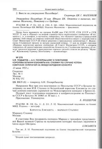 Телеграмма королевы Бельгии Елизаветы И.В. Сталину по случаю успеха советских скрипачей на международном конкурсе. 13 июня 1951 г. // РГАСПИ. Ф. 558. Оп. 11. Д. 211. Л. 83. Рукописный подлинник на бланке государственной телеграммы Бельгии.