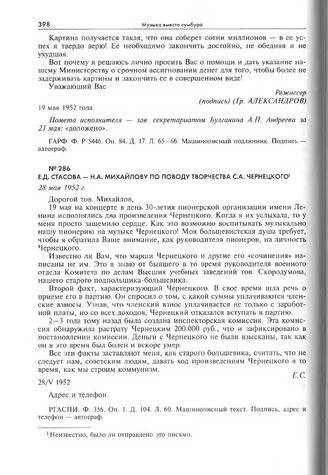 Е.Д. Стасова - Н.А. Михайлову по поводу творчества С.А. Чернецкого. 28 мая 1952 г. // РГАСПИ. Ф. 356. Оп. 1. Д. 104. Л. 60. Машинописный текст.