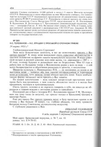 Н.С. Голованов - Н.С. Хрущеву с просьбой о срочном приеме. 29 марта 1953 г.