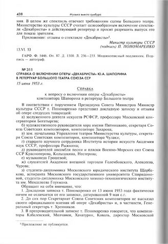 Справка о включении оперы «Декабристы» Ю.А. Шапорина в репертуар Большого театра Союза ССР. 15 июня 1953 г.