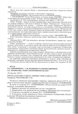 П.К. Пономаренко - Г.М. Маленкову о кончине дирижера Н.С. Голованова. 28 августа 1953 г.