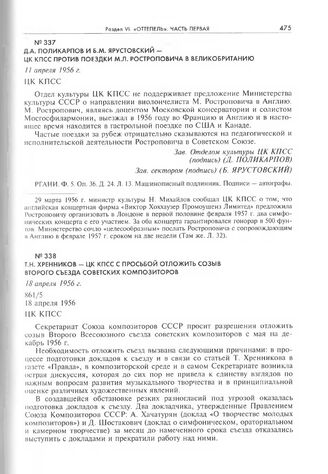 Т.Н. Хренников - ЦК КПСС с просьбой отложить созыв второго съезда советских композиторов. 18 апреля 1956 г.