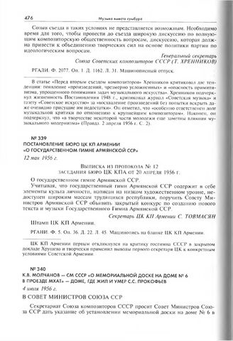 Постановление бюро ЦК КП Армении «О государственном гимне Армянской ССР». 12 мая 1956 г. // РГАНИ. Ф. 5. Оп. 36. Д. 22. Л. 45. Машинопись на бланке ЦК КП Армении.