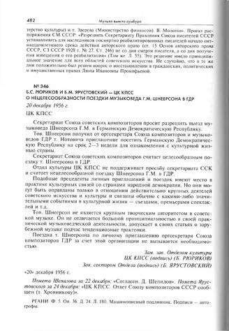 Б.С. Рюриков и Б.М. Ярустовский - ЦК КПСС о нецелесообразности поездки музыковеда Г.М. Шнеерсона в ГДР. 20 декабря 1956 г. // РГАНИ. Ф. 5. Оп. 36. Д. 24. Л. 180. Машинописный подлинник.