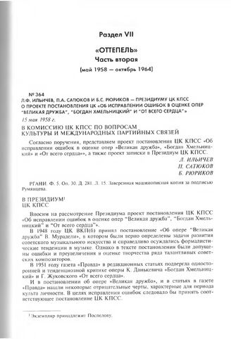 О проекте постановления ЦК КПСС «Об исправлении ошибок в оценке опер "Великая дружба", "Богдан Хмельницкий" и "От всего сердца"». 15 мая 1958 г.