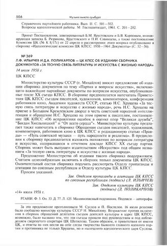 Л.Ф. Ильичев и Д.А. Поликарпов - ЦК КПСС об издании сборника документов «За тесную связь литературы и искусства с жизнью народа». 14 июля 1958 г. // РГАНИ. Ф. 5. Оп. 33. Д. 77. Л. 125. Машинописный подлинник.