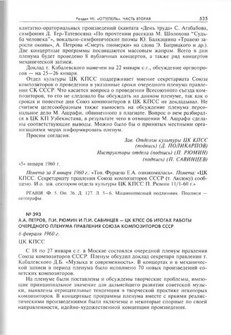 А.А. Петров, П.И. Рюмин и П.И. Савинцев - ЦК КПСС об итогах работы очередного пленума Правления союза композиторов СССР. 6 февраля 1960 г.