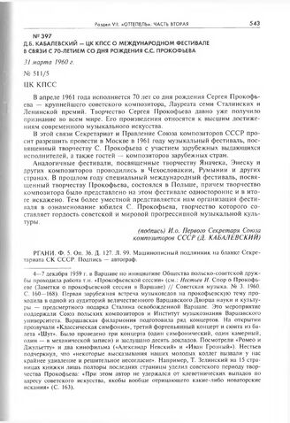 Д.Б. Кабалевский - ЦК КПСС о международном фестивале в связи с 70-летием со дня рождения С.С. Прокофьева. 31 марта 1960 г.