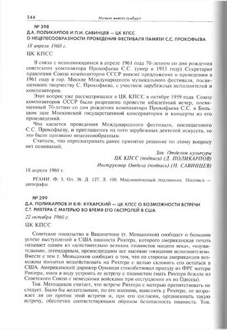 Д.А. Поликарпов и П.И. Савинцев - ЦК КПСС о нецелесообразности проведения фестиваля памяти С.С. Прокофьева. 18 апреля 1960 г.