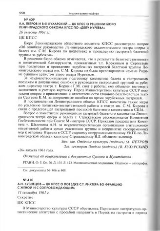 А.А. Петров и В.Ф Кухарский - ЦК КПСС о решении бюро Ленинградского обкома КПСС по «делу Нуреева». 26 августа 1961 г. // РГАНИ. Ф. 5. Оп. 36. Д. 135. Л. 123. Машинописный подлинник.