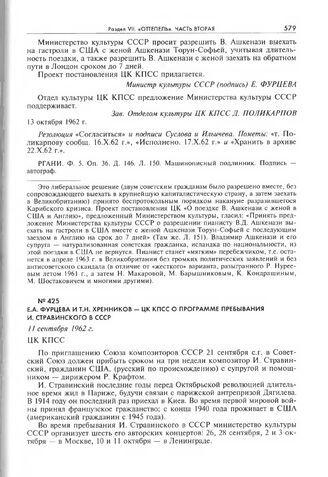 Е.А. Фурцева и Т.Н. Хренников - ЦК КПСС о программе пребывания И. Стравинского в СССР. 11 сентября 1962 г.