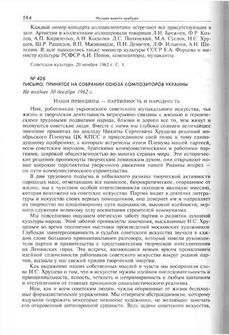 Письмо, принятое на собрании Союза композиторов Украины. Не позднее 30 декабря 1962 г. // РГАНИ. Ф. 5. Оп. 55. Д. 49. Л. 20-22. Машинописный текст.