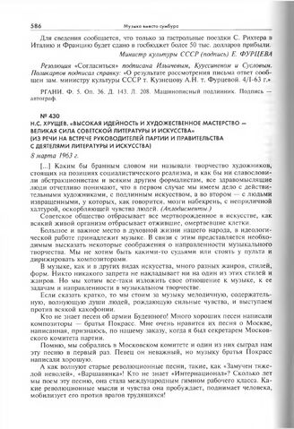 Н.С. Хрущев. «Высокая идейность и художественное мастерство - великая сила советской литературы и искусства» (из речи на встрече руководителей партии и правительства с деятелями литературы и искусства). 8 марта 1963 г. // Опубликовано: Хрущев Н.С. Высокое призвание литературы и искусства. М.: Издательство «Правда», 1963. С. 212-216.