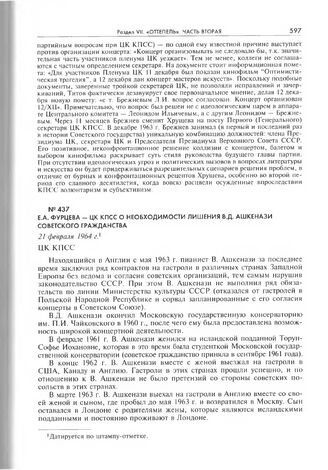 Е.А. Фурцева - ЦК КПСС о необходимости лишения В.Д. Ашкенази советского гражданства. 21 февраля 1964 г. // РГАНИ. Ф. 5. Оп. 55. Д. 106. Л. 57-58. Машинописный подлинник.