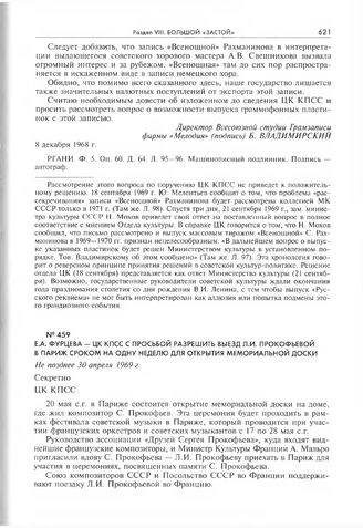 Е.А. Фурцева - ЦК КПСС с просьбой разрешить выезд Л.И. Прокофьевой в Париж сроком на одну неделю для открытия мемориальной доски. Не позднее 30 апреля 1969 г.