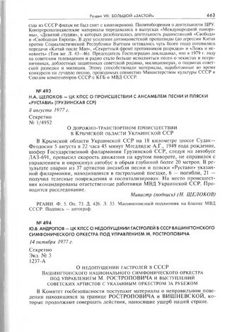 Н.А. Щелоков - ЦК КПСС о происшествии с ансамблем песни и пляски «Рустави» (Грузинская ССР). 8 августа 1977 г.