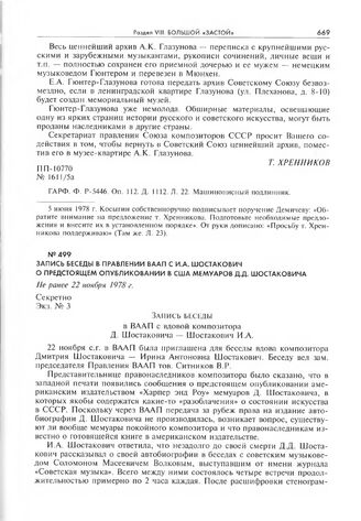 Запись беседы в Правлении ВААП с И.А. Шостакович о предстоящем опубликовании в США мемуаров Д.Д. Шостаковича. Не ранее 22 ноября 1978 г. // РГАНИ. Ф. 5. Оп. 75. Д. 412. Л. 21-22. Машинописный текст.