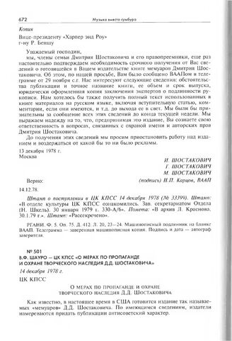 В.Ф. Шауро - ЦК КПСС «О мерах по пропаганде и охране творческого наследия Д.Д. Шостаковича». 14 декабря 1978 г.