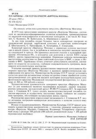 Ю.Я. Барабаш - СМ СССР об оркестре «Виртуозы Москвы». 20 июля 1981 г.