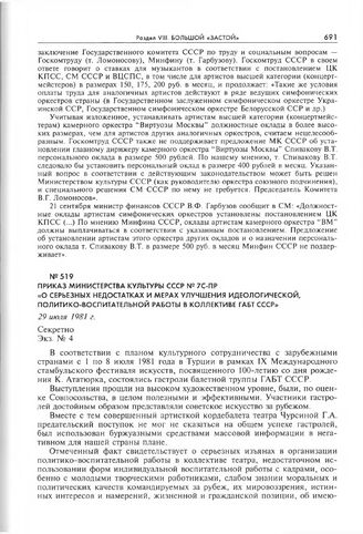 Приказ Министерства культуры СССР № 7С-ПР «О серьезных недостатках и мерах улучшения идеологической, политико-воспитательной работы в коллективе ГАБТ СССР». 29 июля 1981 г.