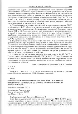 Руководство Московского камерного оркестра - В.Н. Макееву о нездоровой конкуренции со стороны камерного ансамбля «Виртуозы Москвы». Не ранее 8 сентября 1981 г.