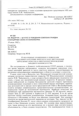 В.В. Федорчук - ЦК КПСС о поведении советских граждан в концертных залах и в кинотеатрах. 19 июля 1982 г.