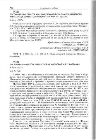 Постановление СМ СССР № 625 об увековечении памяти Народного артиста СССР, лауреата Ленинской премии Л.Б. Когана. 8 июля 1983 г. // ГАРФ. Ф. P-5446. Оп. 1. Д. 964. Л. 8. Машинописный подлинник.
