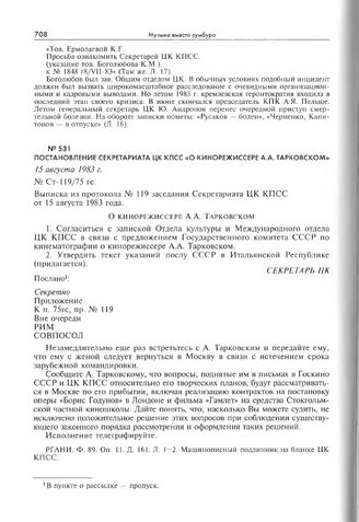 Постановление Секретариата ЦК КПСС «О кинорежиссере А.А. Тарковском». 15 августа 1983 г. // РГАНИ. Ф. 89. Оп. 11. Д. 161. Л. 1-2. Машинописный подлинник на бланке ЦК КПСС.
