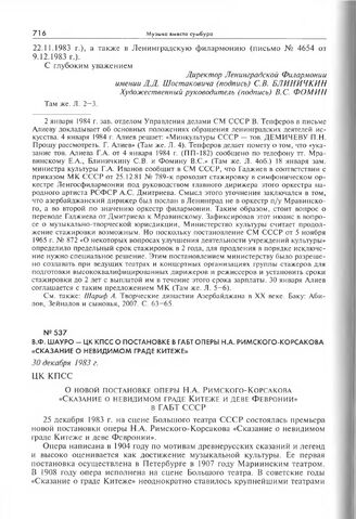 В.Ф. Шауро - ЦК КПСС о постановке в ГАБТ оперы Н.А. Римского-Корсакова «Сказание о невидимом граде Китеже». 30 декабря 1983 г. // РГАНИ. Ф. 5. Оп. 89. Д. 154. Л. 96-98. Машинописный подлинник.