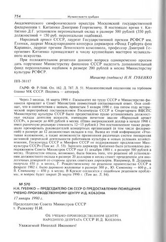 Н.Н. Губенко - Председателю СМ СССР о предоставлении помещения учебно-производственному центру И.Д. Кобзона. 17 января 1990 г. // ГАРФ. Ф. Р-5446. Оп. 162. Д. 787. Л. 45. Машинописный подлинник на бланке.