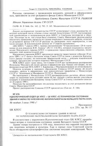 Идеологический отдел ЦК КПСС - ЦК КПСС «О техническом состоянии здания и мерах по укреплению материальной базы Большого театра СССР». Не позднее 5 июля 1990 г.