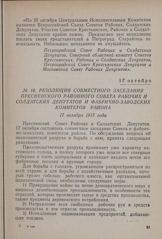 Резолюция совместного заседания Пресненского районного совета рабочих и солдатских депутатов и фабрично-заводских комитетов района. 17 октября 1917 года