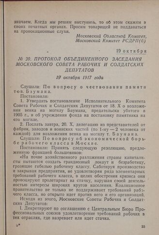 Протокол объединенного заседания Московского совета рабочих и солдатских депутатов. 19 октября 1917 года // ЦАОР. Протоколы заседаний Московского Совета Рабочих Депутатов (в копиях), кн. III, инвент. № 301/С, стр. 401-402.