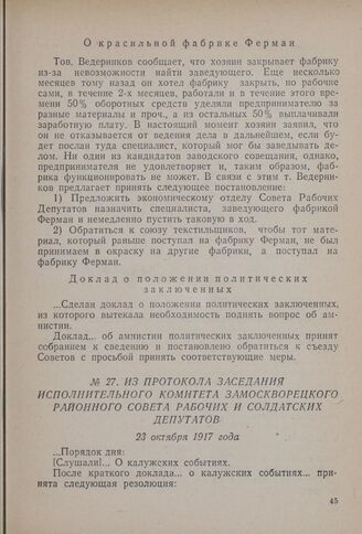 Из протокола заседания Исполнительного комитета Замоскворецкого районного совета рабочих и солдатских депутатов. 23 октября 1917 года // Мособлархив, ф. Замоскворецкого райсовета, д. № 8, л. 13-14.