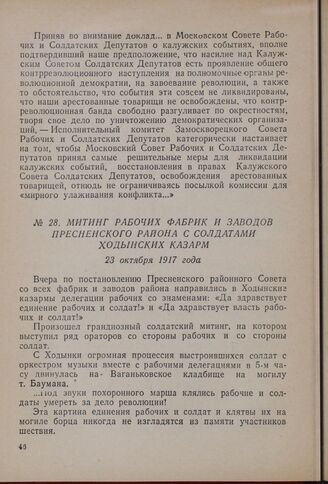 Митинг рабочих фабрик и заводов Пресненского района с солдатами Ходынских казарм. 23 октября 1917 года // «Социал-Демократ» № 191 от 24 октября 1917 г.
