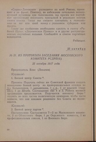 Из протокола заседания Московского комитета РСДРП(б). 25 октября 1917 года // Архив Института истории партии МГК ВКП(б), д. Копий № 3, л. 2.