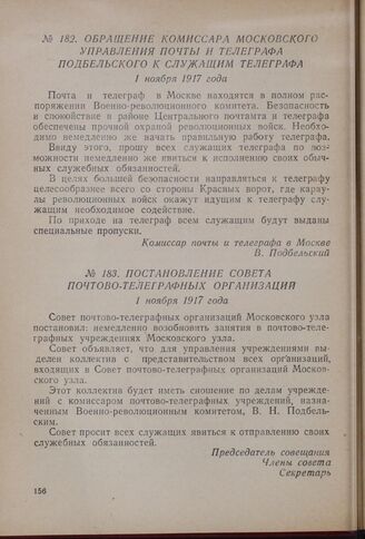 Постановление совета почтово-телеграфных организаций. 1 ноября 1917 года // «Известия Московского Совета Рабочих Депутатов» № 202 от 1 ноября 1917 г.