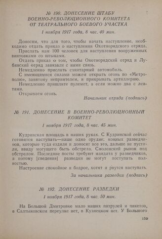 Донесение штабу Военно-революционного комитета от Театрального боевого участка. 1 ноября 1917 года, 8 час. 40 мин. // ЦАОР, ф. 1, д. № 154/154, л. 41.