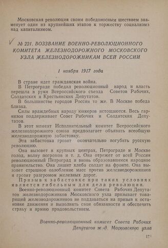 Воззвание Военно-революционного комитета железнодорожного Московского узла железнодорожникам всей России. 1 ноября 1917 года