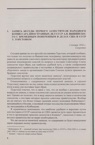 Запись беседы первого заместителя народного комиссара иностранных дел СССР А.Я. Вышинского с временным поверенным в делах США в СССР У. Торстоном. 2 января 1942 г. // АВП РФ, ф. 06, оп. 4, п. 2, д. 22, л. 1-2. Опубл.: Советско-американские отношения. 1939-1945. — М., 2004. — С. 188-189 (далее: Советско-американские отношения. 1939-1945 ...).