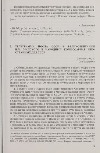 Телеграмма посла СССР в Великобритании И.М. Майского в Народный комиссариат иностранных дел СССР. 2 января 1942 г. // АВП РФ, ф. 059, оп. 1, п. 371, д. 2525, л. 14-11.