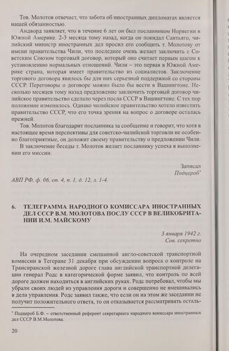 Телеграмма народного комиссара иностранных дел СССР В.М. Молотова послу СССР в Великобритании И.М. Майскому. 3 января 1942 г. // АВП РФ, ф. 059, оп. 1, п. 373, д. 2540, л. 5-6.