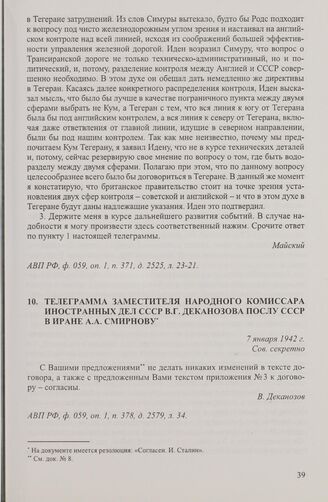 Телеграмма заместителя народного комиссара иностранных дел СССР В.Г. Деканозова послу СССР в Иране А.А. Смирнову. 7 января 1942 г. // АВП РФ, ф. 059, оп. 1, п. 378, д. 2579, л. 34.