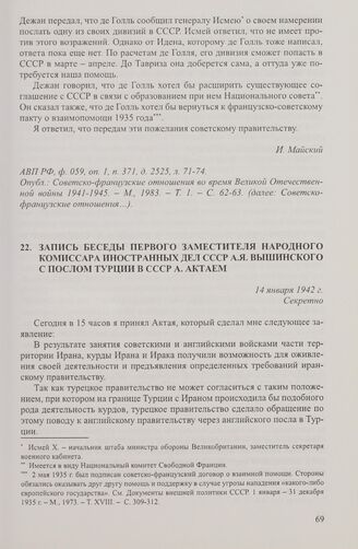 Запись беседы первого заместителя народного комиссара иностранных дел СССР А.Я. Вышинского с послом Турции в СССР А. Актаем. 14 января 1942 г. // АВП РФ, ф. 06, оп. 4, п. 2, д. 22, л. 39.