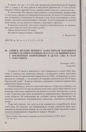Запись беседы первого заместителя народного комиссара иностранных дел СССР А.Я. Вышинского с временным поверенным в делах США в СССР У. Торстоном. 16 января 1942 г.